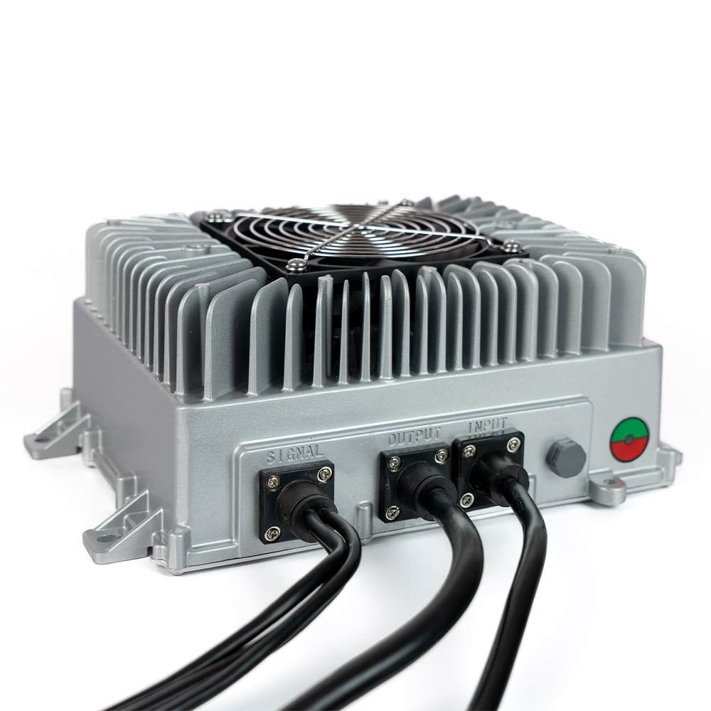 O modelo para 96-132V tem capacidade de carga de 3,3kW e é adequado para uso em conjunto com o Powertrain FTE WEG 43 e CONVERSOR DC-DC 110V – 500W.