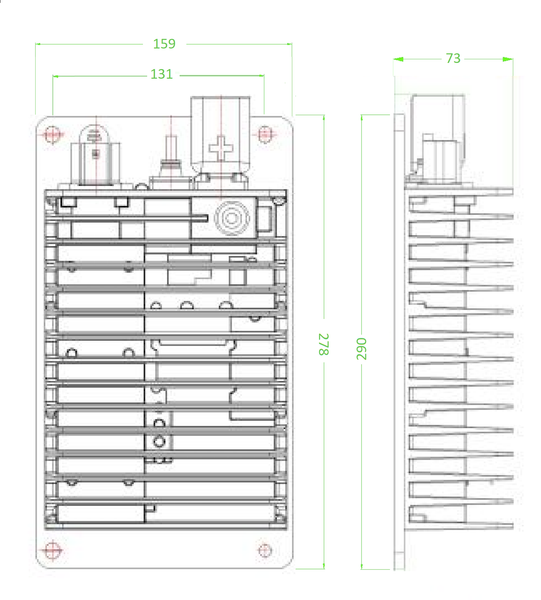 O modelo de CONVERSOR DC-DC 355V é adequado para o uso em conjunto com o Powertrain FTE WEG 130 e o Carregador de bordo 355V – 3,3kW.