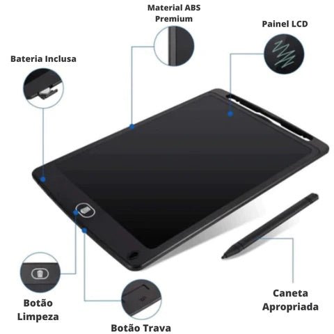 Além disso, o Tablet da Criatividade é fabricado com materiais de alta qualidade, possui caneta exclusiva e bateria durável. Ele oferece muito espaço para desenhos e escritas, ajudando a desenvolver o entusiasmo em aprender a escrever e desenhar sozinho, melhorando a caligrafia e o desenho de uma criança.